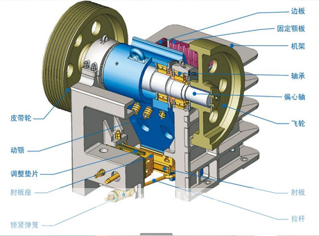 電動機驅動皮帶和皮帶輪,通過偏心軸使動顎上下運動,當動顎上升時肘板與動顎間夾角變大,從而推動動顎板向固定顎板接近,與此同時物料被壓碎或劈碎,達到破碎的目的;當動顎下行時,肘板與動顎間夾角變小,動顎板在拉桿、彈簧的作用下,離開固定顎板,此時已破碎物料從破碎腔下口排出。隨著電動機連續(xù)轉動而破碎機動顎作周期性地壓碎和排泄物料,實現(xiàn)批量生產。